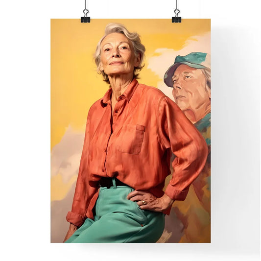 A Poster of Woman in her 70s wearing stylish casual clothes - A Woman Standing In Front Of A Painting