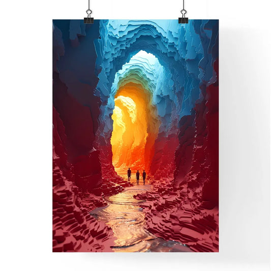 A Poster of paper art style illustration - A Group Of People Walking In A Cave