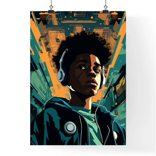 A Poster of a black teenager listening - A Boy Wearing Headphones And Looking Up