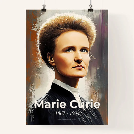 Portrait of Marie Curie, 1867 - 1934. Impressionistic painting of a woman with short hair wearing a black shirt.