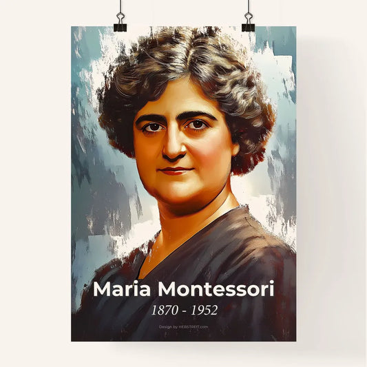Portrait of Maria Montessori, 1870 - 1952. Impressionistic painting of a woman with curly hair.