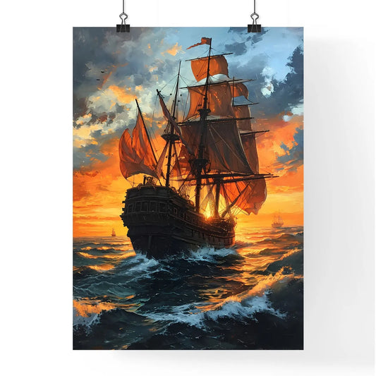 A Poster of a painting of a big ship with big sail - A Ship In The Sea