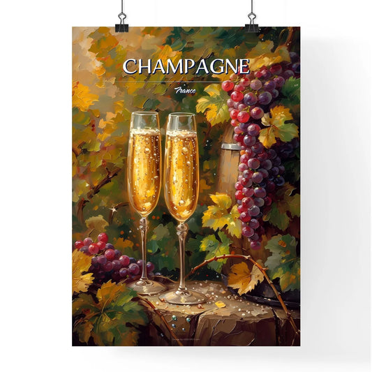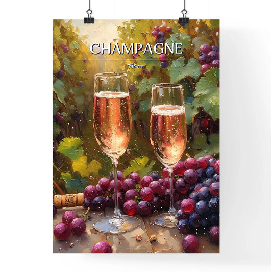 Champagne, France - Art print of a pair of champagne glasses next to grapes
