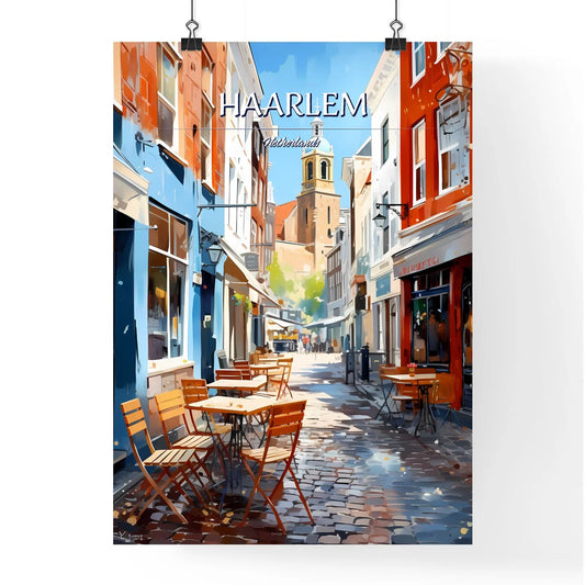 Haarlem, Netherlands - Art print of a street with tables and chairs in a city