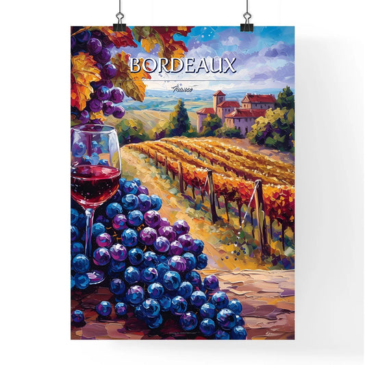 Bordeaux, France - Art print of a painting of a wine glass and grapes in a vineyard