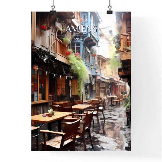 Amiens, France - Art print of a street with tables and chairs in a rainy day