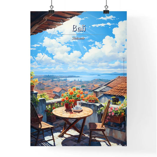 On the roofs of Bali, Indonesia - Art print of a table and chairs on a balcony with a view of a city and water