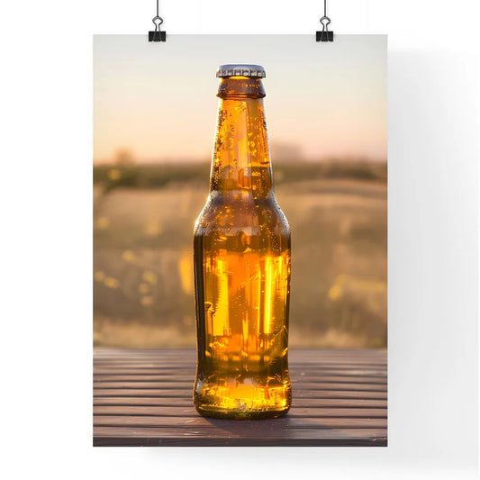 An empty beer bottle stands on a wooden table - Art print of a bottle of beer on a table