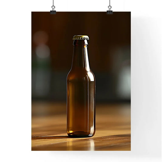 An empty beer bottle stands on a wooden table - Art print of a brown bottle on a wooden surface