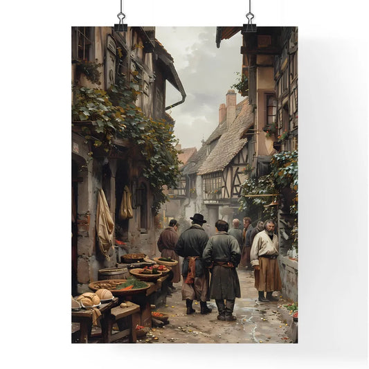 Vintage 18th Century German Weimar Street Scene Depicting Lively Market Activity with People Walking