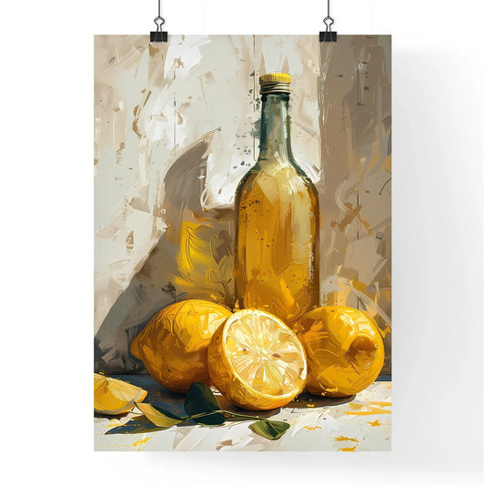 Abstract Digital Painting: Vibrant Lemon and Green Bottle Still Life with Light Pink and Gray Accents, Classical Balance, Cinestill 50d