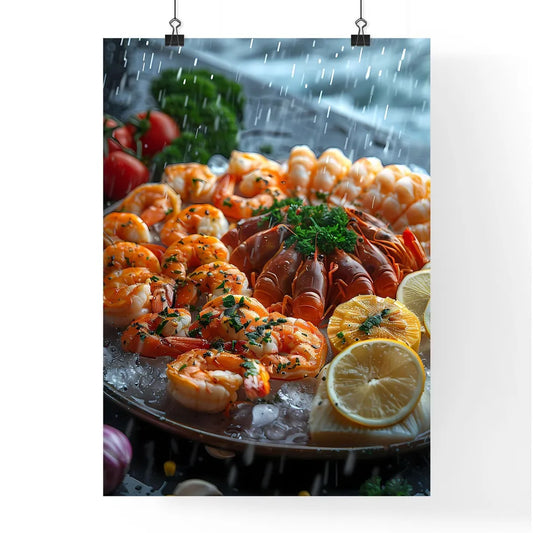 Dramatic Depiction of Seafood Feast: Plate of Sea Delicacies Adorned with Lemons and Tomatoes Against a Vibrant Oceanic Backdrop