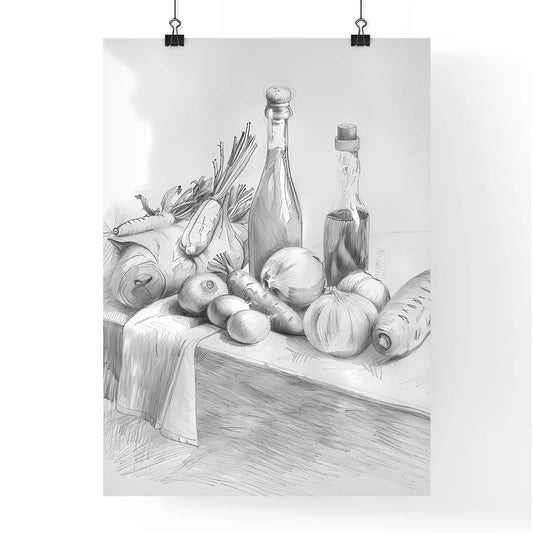 Kitchen Counter Still Life: Vegetables and Oil Sketch on Tabletop, Vibrant Art Print