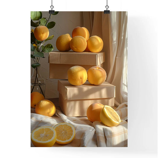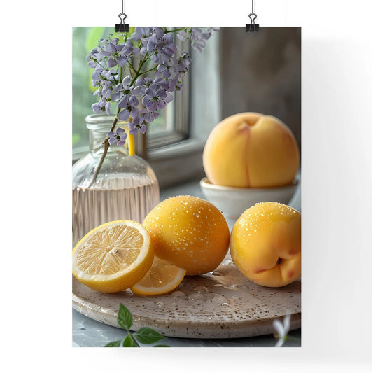 Minimalist Food Composition with Peaches, Lemon, and Tabletop in Angled Perspective