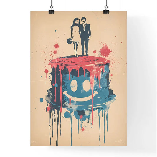 Colorful 1970s Pop Art Wedding Poster: Retro Bride and Groom on Cake, Acid Smiley Background