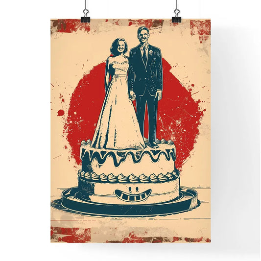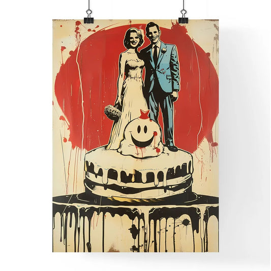 Retro Pop Art Wedding Cake Poster: 1970s Bride & Groom on Cute Character, Acid Smiley Background, Vintage Pop Culture Design