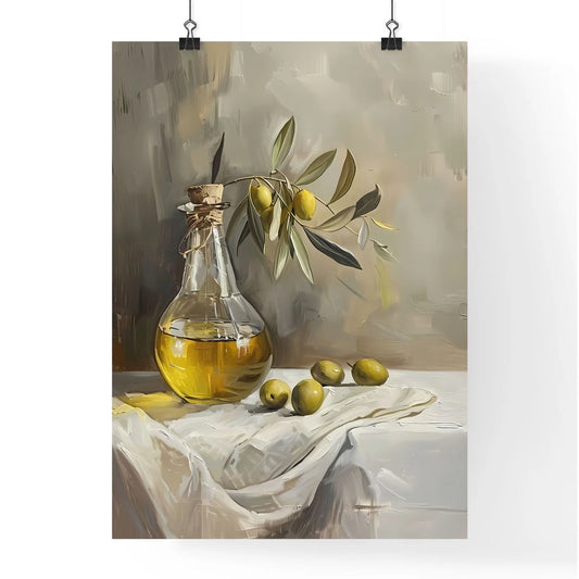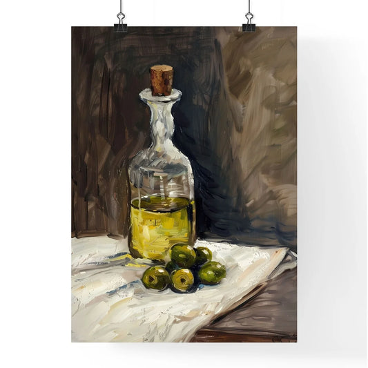 Fine Art Painting: Glass Bottle with Olive Oil and Green Olives on White Tablecloth, 1880s, Broad Gestural Style, Saturated Pigment Pools, Visible Brush Strokes, Muted Tonality