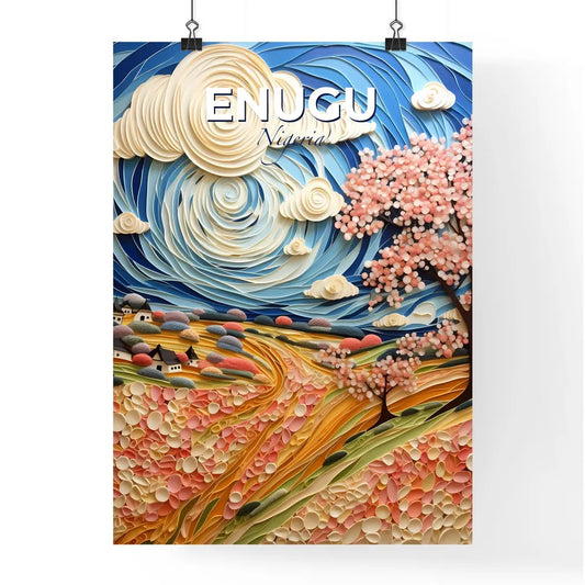 Vibrant Painted Enugu Nigeria Skyline Depicting Serene Landscape with Trees and House