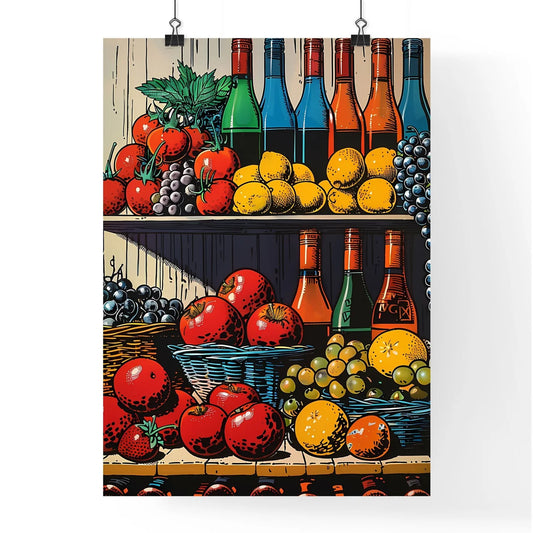 Minimalist Still Life Pop Art: Fruits and Veggies on a Shelf in a Bold and Ironic Consumerist Context