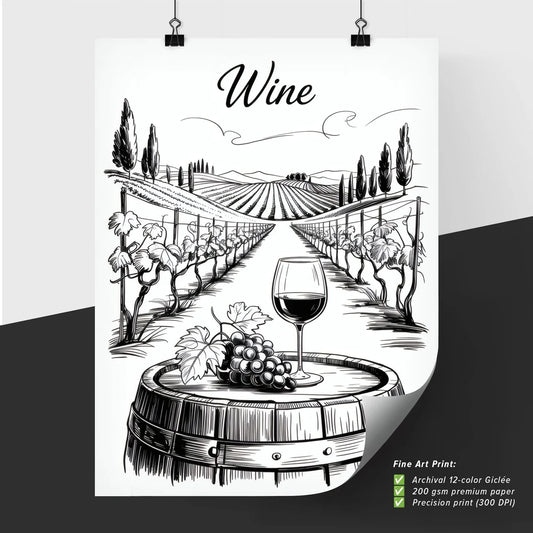 Elegant Wine Glass Overlooking Scenic Vineyard Landscape in Artistic Black and White Illustration.