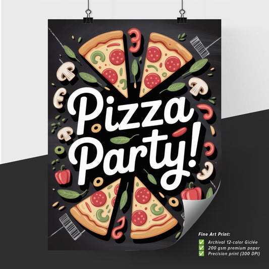 Fun and Engaging Pizza Party Celebration Illustration with Tasty Ingredients and Bold Typography.