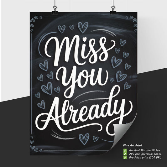 Heartfelt Chalkboard Design Expressing 'Miss You Already' with Decorative Hearts and Whimsical Typography.