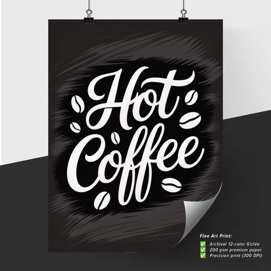 Hot Coffee Typography with Coffee Beans on Dark Background for Café and Beverage Promotions.