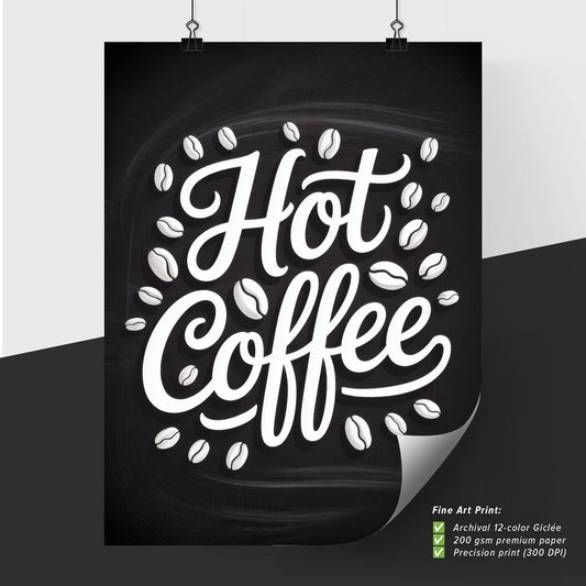 Stylized Typography Featuring 'Hot Coffee' Surrounded by Coffee Beans on a Black Background.