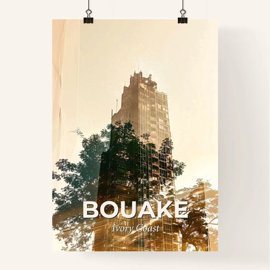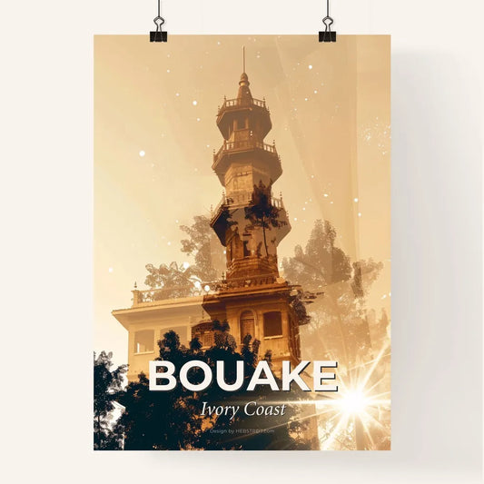 Bouake Skyline Double Exposure Art Print - A tall tower with trees and sun
