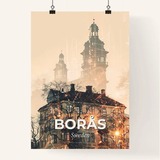 Borlange City Skyline Double Exposure Art Poster - A building with a clock tower