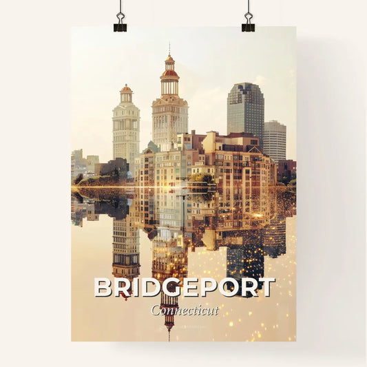 Bridgeport Skyline Glow Pastel Beige Poster - A city skyline reflected in water