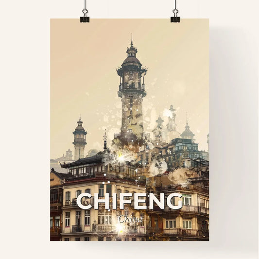 Chifeng Skyline Art Poster: Local Colors, Bright Beige - A tall tower in a city