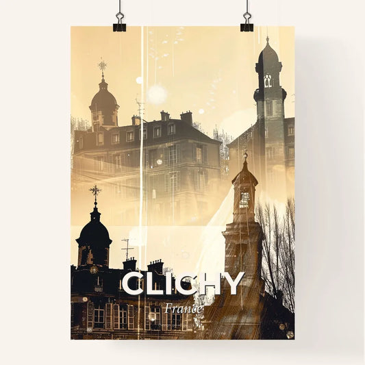 Clichy Skyline Silhouette Beige Poster - A group of buildings with a bell tower