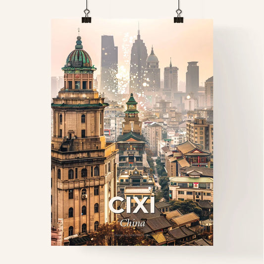 Cixi City Skyline Composite Art Poster - A city with tall buildings and fireworks