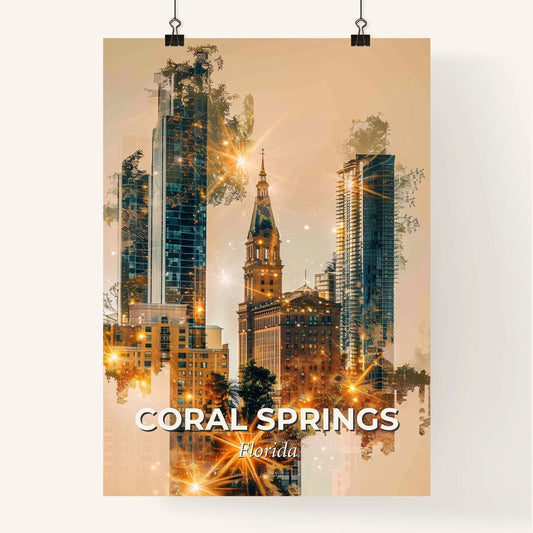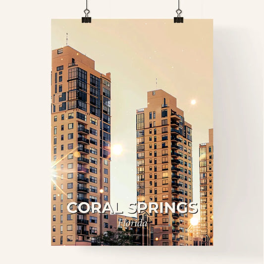 Coral Springs Cityscape Silhouette Poster - A group of tall buildings with sun shining through them