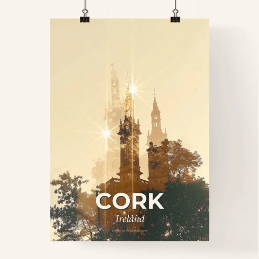 Cork Silhouette Skyline Composite Art Poster - A building with trees and sun rays