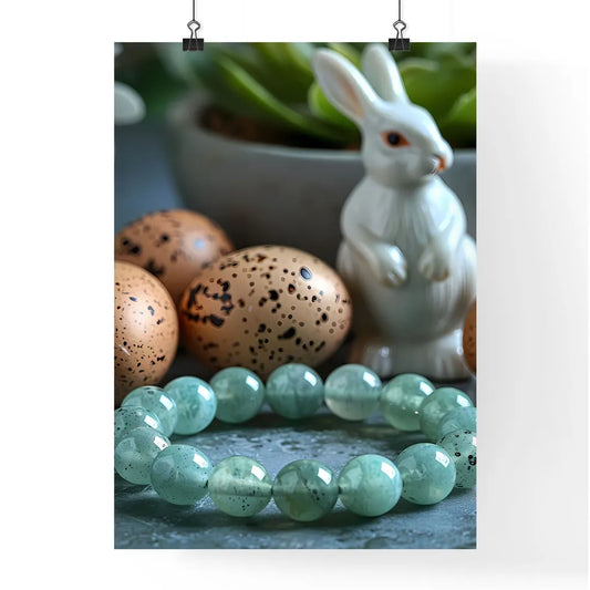 Artful Easter Still Life: Hand-Painted Bunny Figurine, Glass Bangle, Pastel Eggs