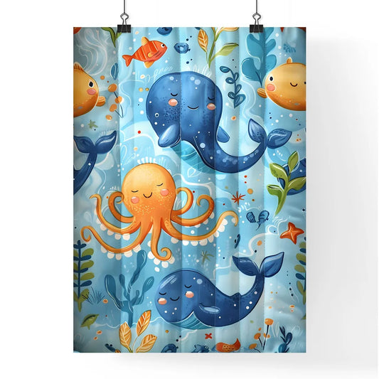 Vibrant ocean-themed nursery fabric featuring an octopus and whale pattern on a light blue background with a white border