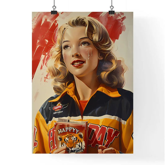 Utopian Vintage 1980s Horror Movie Princess Advertising - Happy Birthday Packaging with Blonde Princess in Ice Hockey Uniform and Tiger Logo. 40 Years Specialism Illustration.
