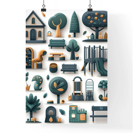 Detailed, geometric, street-savvy realistic urban scene icon set, with found objects, in green and navy, with subtle shading, on white background