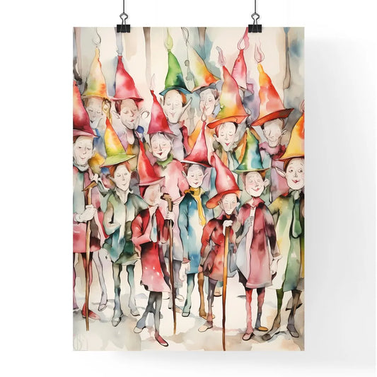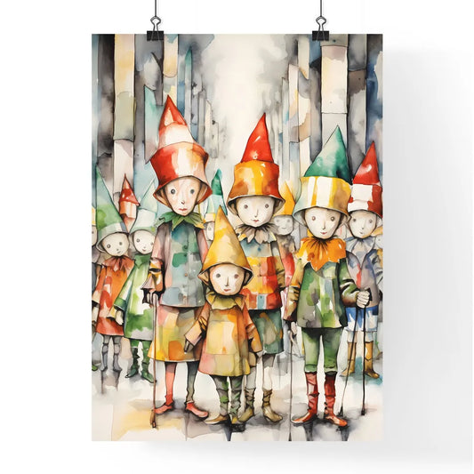 A Poster of whimsical colorful illustration of Christmas Elfs - A Group Of People Wearing Hats