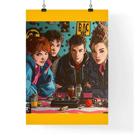 A Poster of 'back to the 80s'in a colorful background - A Group Of People Sitting At A Table