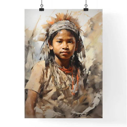 A Poster of indigenous child portrait cinematic light - A Child Wearing A Feathered Headdress
