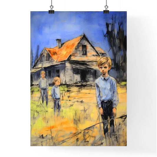 A Poster of In a country side cottage yard - A Painting Of A Group Of Children Standing In Front Of A House