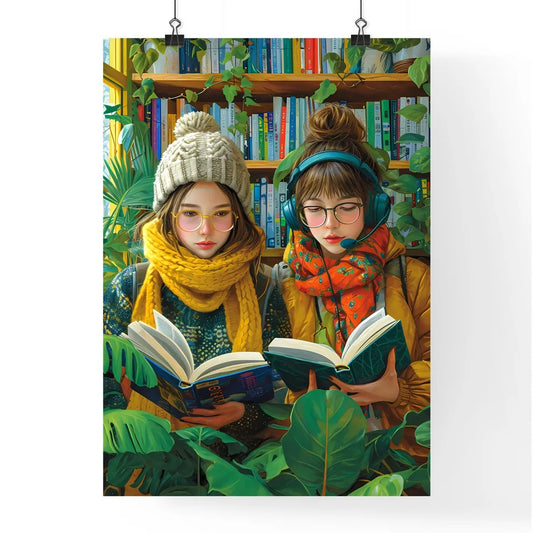 Two trendy young people record a podcast - Art print of two women reading books in a library