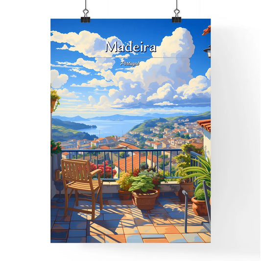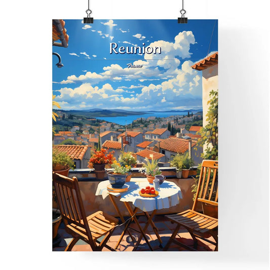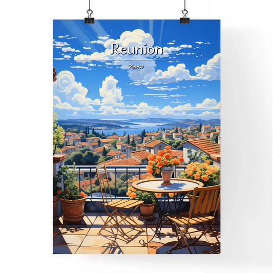 On the roofs of Reunion, France - Art print of a balcony with a table and chairs and a view of the city