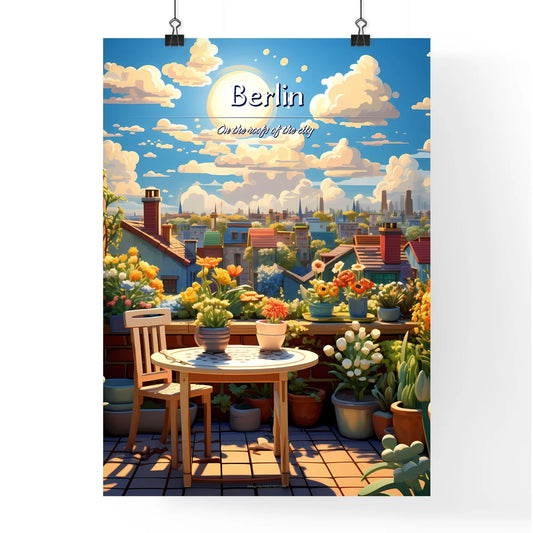 On the roofs of London, UK - Art print of a table and chairs on a rooftop overlooking a city