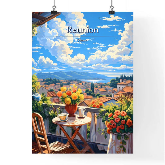 On the roofs of Reunion, France - Art print of a table and chairs on a balcony overlooking a city