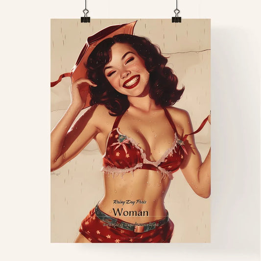 Rainy Day Paris, Woman, sweeping overdrawn lines, A Poster of a woman with curly hair and red lipstick smiling