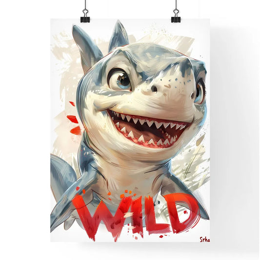 Cute Cartoon Shark Logo: WILD Srhackstrictor - Friendly White Baby Tiger Character with Big Teeth for Childrens T-Shirts and Merchandise.